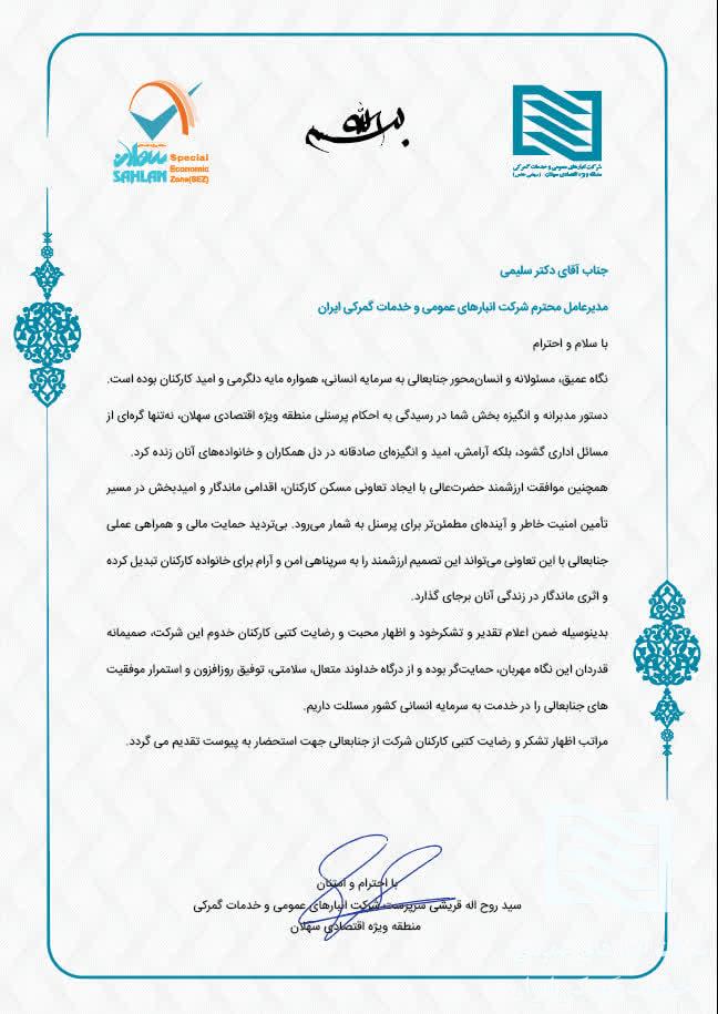 در پایان این مراسم، روح الله قریشی، مدیرعامل شرکت انبارهای عمومی سهلان، ضمن ارائه گزارشی از اقدامات انجام شده و چالشهای موجود، از درایت و تدبیر دکتر سلیمی در پیشبرد اهداف شرکت قدردانی کرد و تقدیرنامهای از سوی تمامی کارکنان به ایشان اهدا نمود.